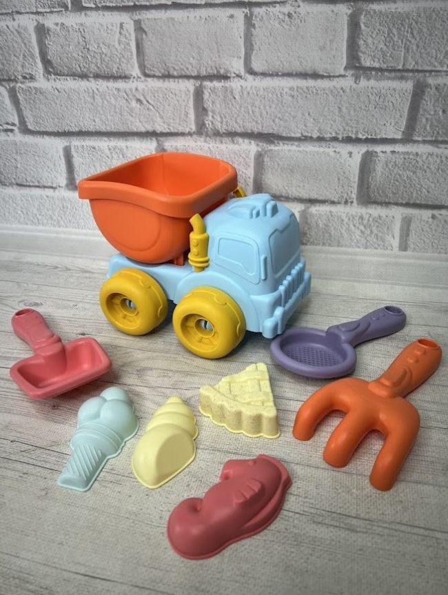 Комплектація: самоскид, лопатка, граблі, сито, 3 формочки